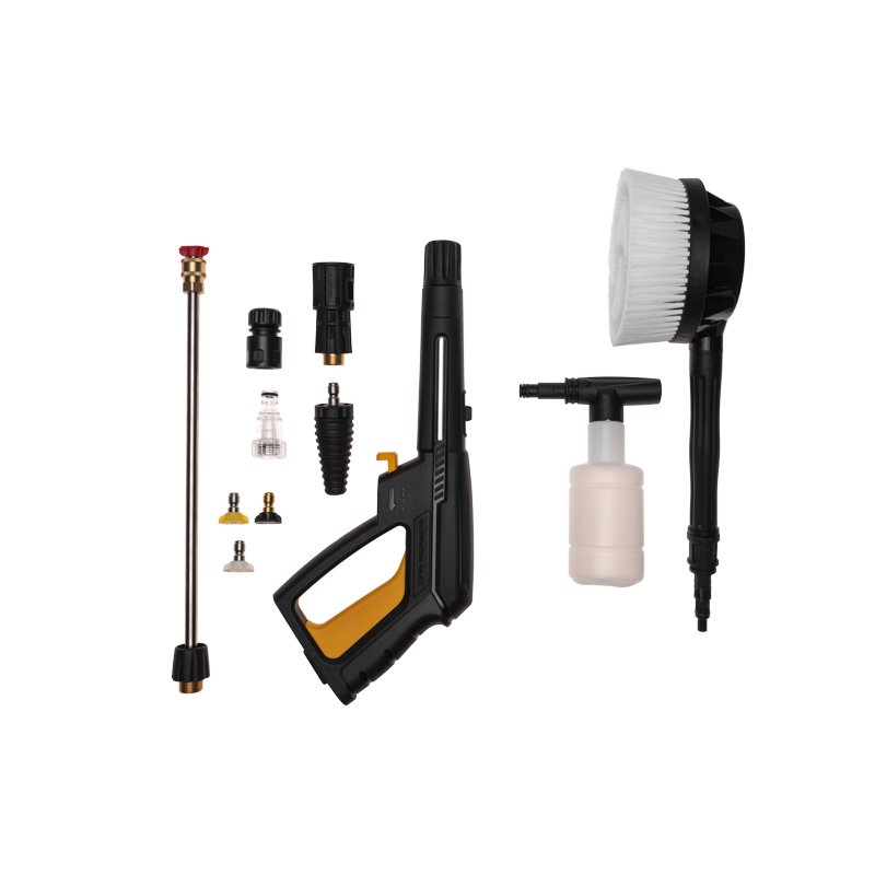 • Регулируемое сопло и сменные быстросъемные насадки с разными углами распыления (0, 15, 25, 40) позволяют изменять интенсивность струи, а также наносить моющие средства.