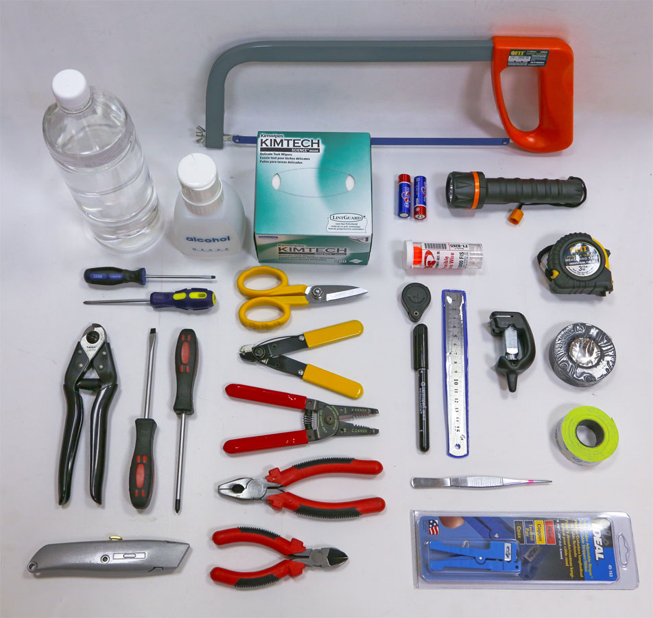Набор включает все, что может понадобиться в работе — от фонарика до салфеток для протирки волокна: