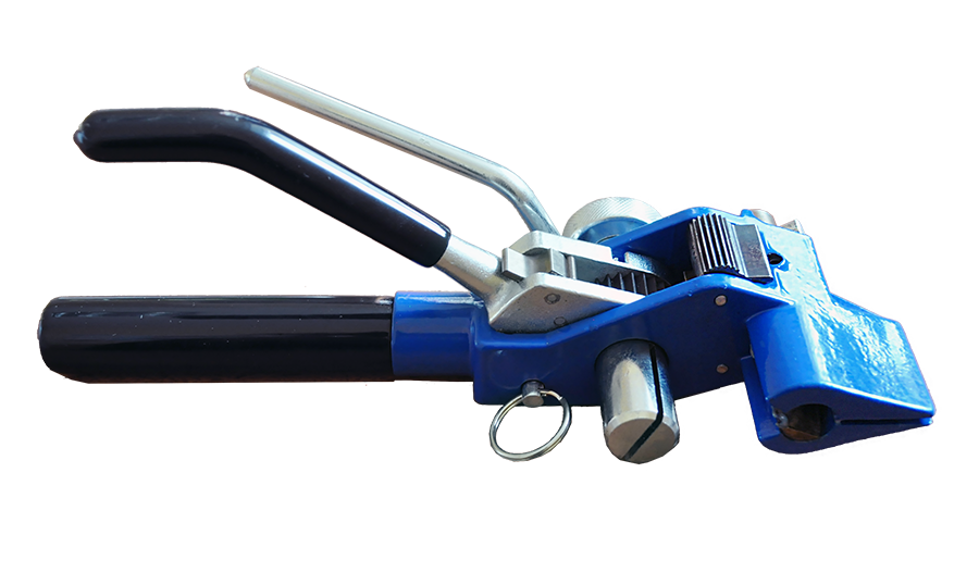 Инструмент для натяжения и резки стальной крепежной ленты. Инструмент имеет храповый механизм для упрощения процесса натяжения ленты. Ручка ножа выполнена из прочной стали и покрыта резиновой оболочкой, что уменьшает вероятность соскальзывания руки во время монтажа и облегчает процесс обрезания ленты.