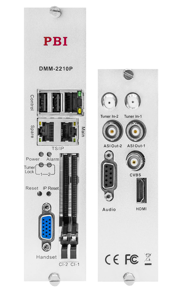 DMM-2210P-S2 PBI - двухканальный приемник DVB-S/S2 MPEG-2 / H.264 / H.265 SD/HD процессор c дескремблером и IP-интерфейсом. Вход: DVB-S/S2, 2xCI/MSD и GbE-IP. Встроенный ремультиплексор. Выход: 2xASI, GbE IP стример, HDMI, CVBS.