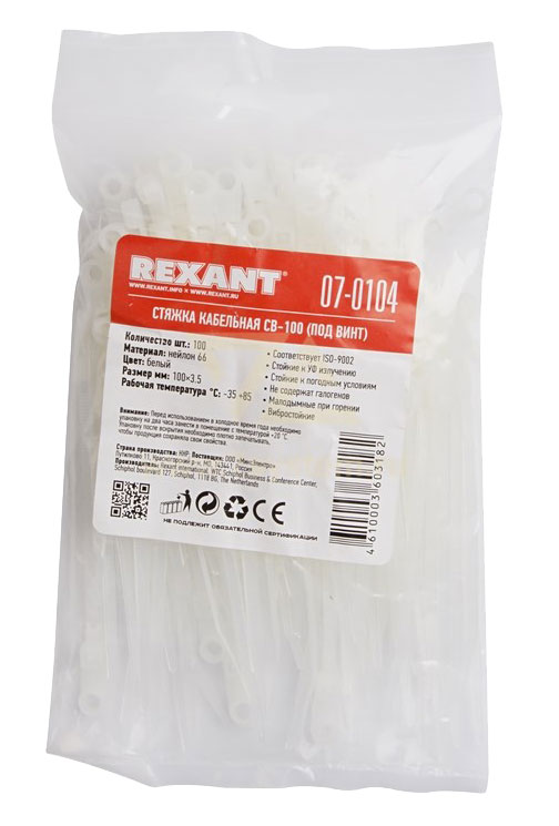 Версия для печатиХомут 100 мм x 3, 6 мм под винт, Rexant, белый, 100 шт