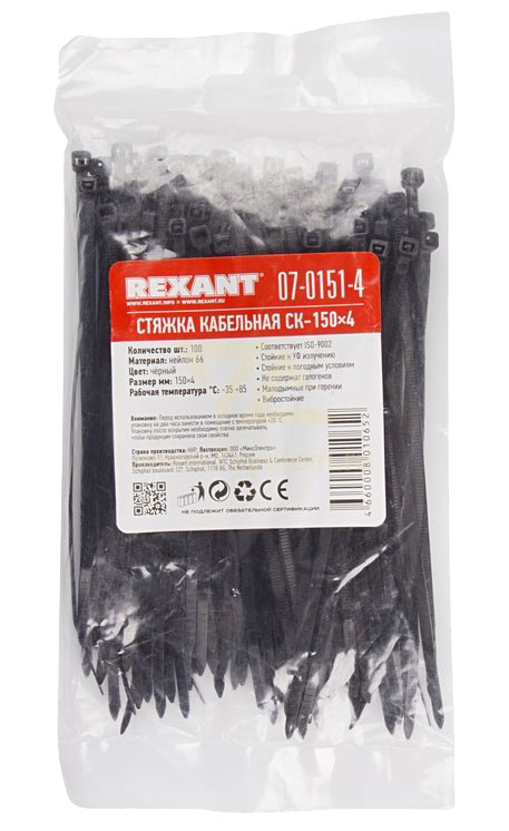 Версия для печатиХомут 150 мм x 3, 6 мм Rexant, черный, 100 шт