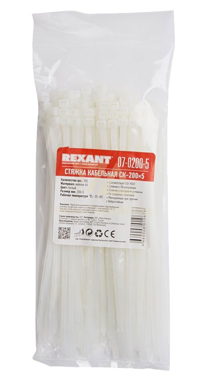 Хомут 200 мм x 5 мм (кабельная стяжка) Rexant предназначен для крепления или обвязки в жгут кабелей и проводов, крепления гибких гофротруб, а также других предметов  к несущей поверхности или для соединения между собой.