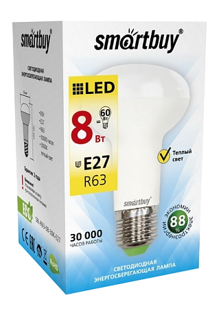 Версия для печатиЛампа LED R63 Smartbuy, Е27, 8 Вт / 60 Вт, 3000 К, тепло-белая
