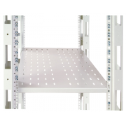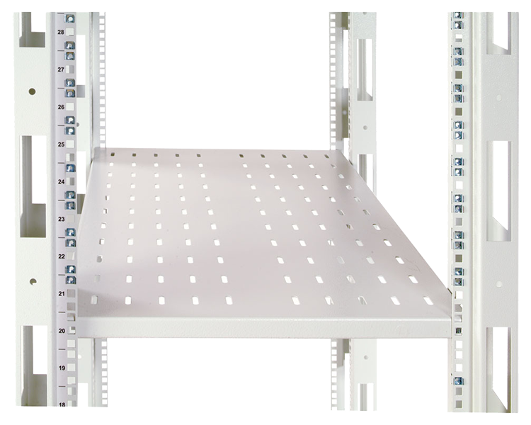 Имеют четыре точки фиксации к вертикальным направляющим шкафов и открытых стоек. Для свободного прохождения охлаждающего воздуха полки имеют развитую перфорацию.