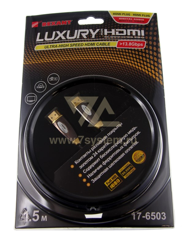 Версия для печатиШнур Luxury HDMI - HDMI GOLD Rexant, 2 фильтра, в блистере, 1.5 м