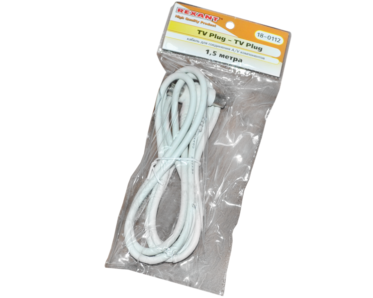 C двух сторон шнура располагаются угловые штекеры TV-разъема. Корпус разъемов выполнен из качественного, легкого и прочного пластика. Контакты никелированы и обеспечивают высокий уровень передачи сигнала к оборудованию. Цвет шнура – белый, а длина составляет 1.5 метра.
