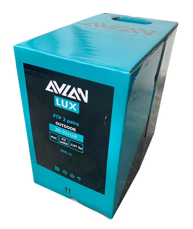 Кабель FTP 2PR 24AWG CAT5e Avlan LUX, наружный, 305 м., для наружной прокладки. Кабель состоит из 2-х пар одножильных медных проводников калибра 24 AWG, заключенных в общую ПЭВД оболочку. Для изготовления проводников используется высококачественная бескислородная медь.